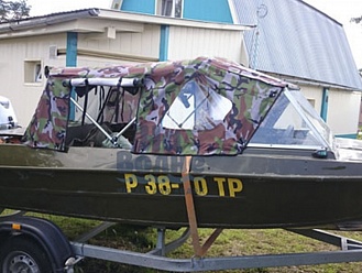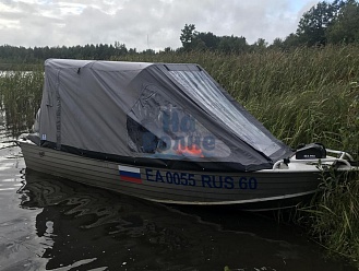 Тент с задней дверью для выхода к мотору, небольшими боковыми окнами и усиленными краями для установки застёжек. Изготовлен из специализированной тентовой ткани Оксфорд 600 повышенной плотности
